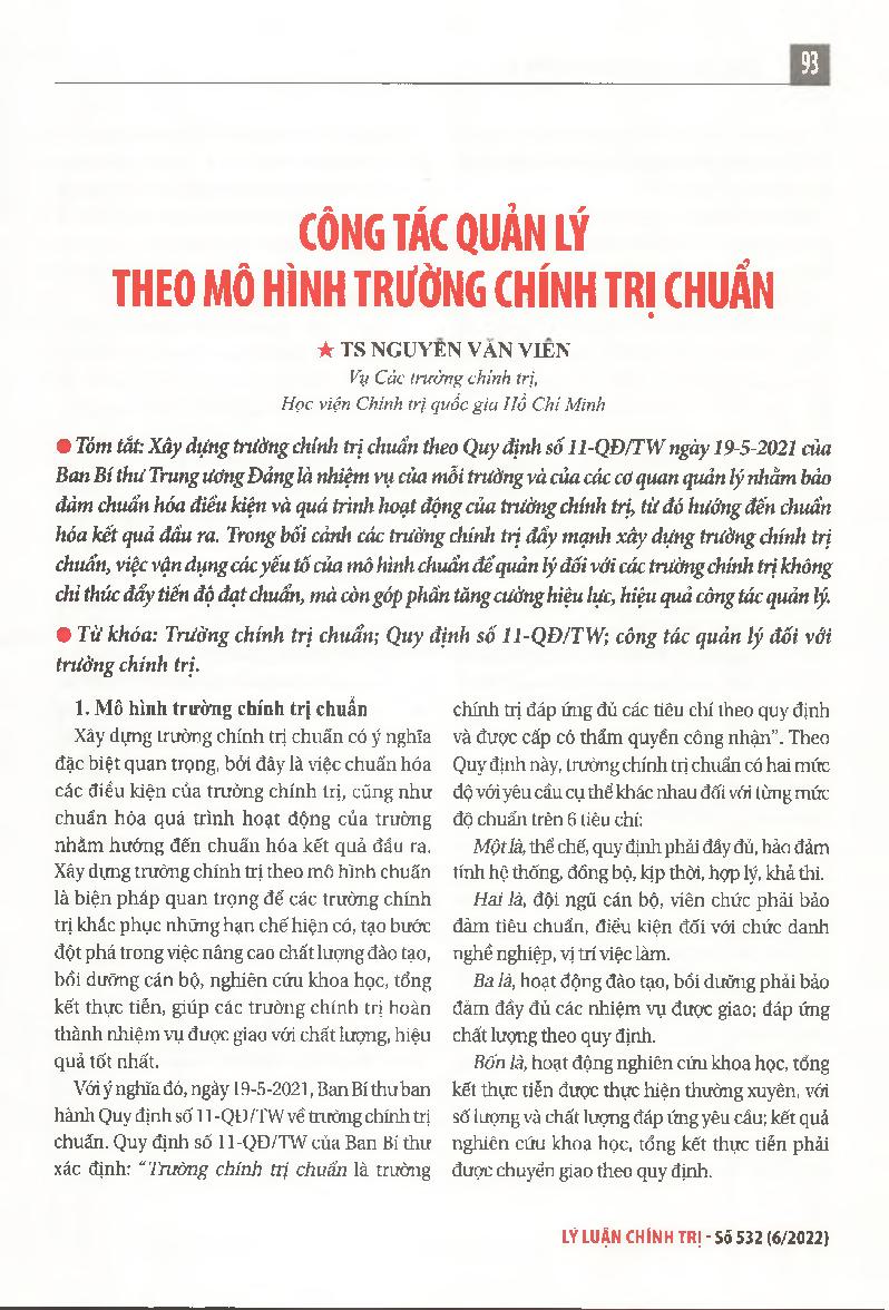 Công tác quản lý theo mô hình trường chính trị chuẩn = Management of political schools in line with the standard political schools model