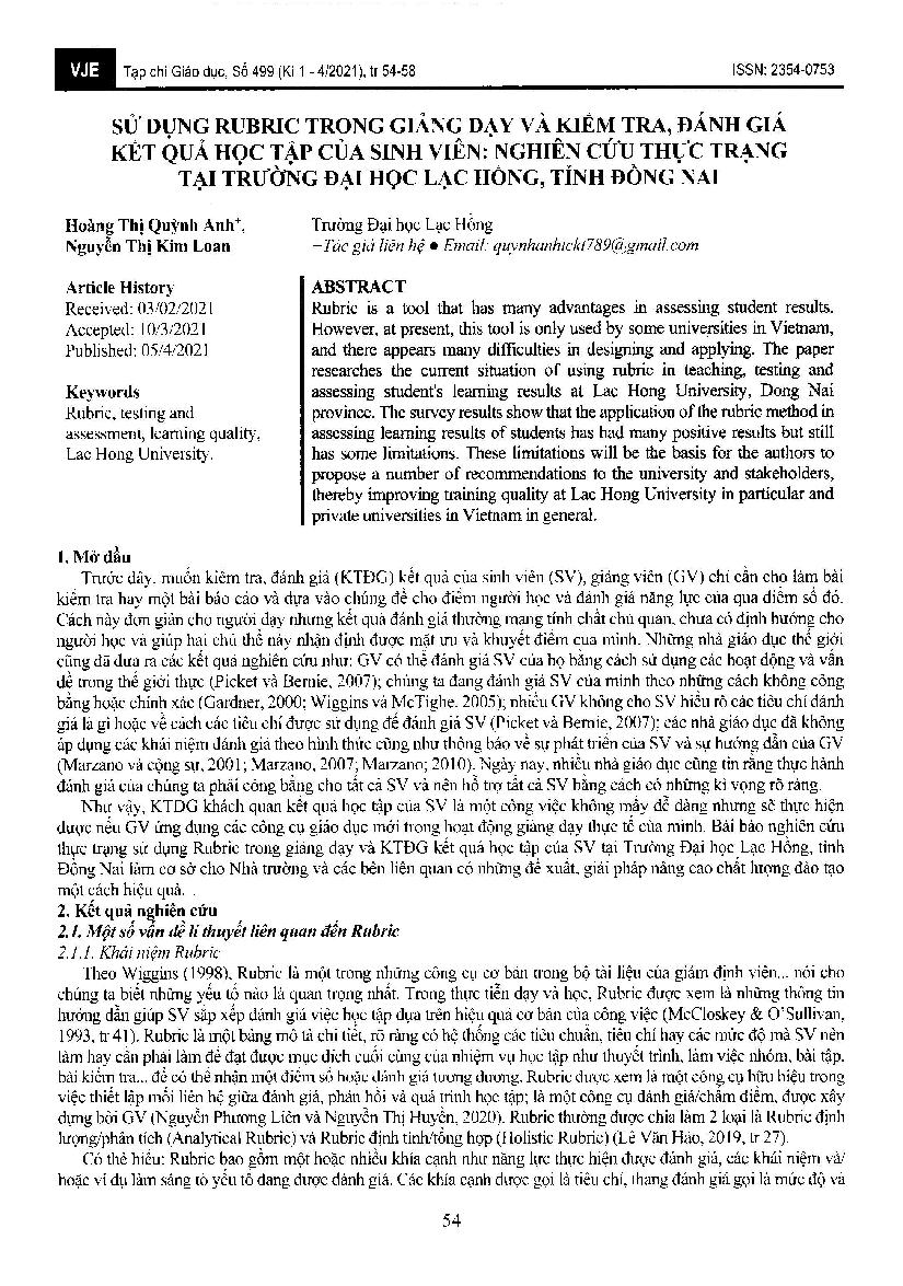 Sử dụng rubric trong giảng dạy và kiểm tra, đánh giá kết quả học tập của sinh viên: Nghiên cứu thực trạng tại Trường Đại học Lạc Hồng, tỉnh Đồng Nai