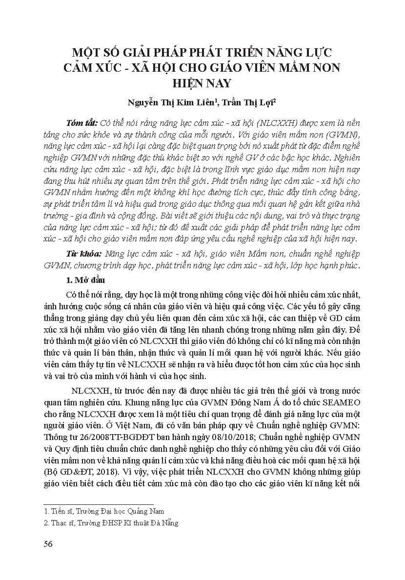 Một số giải pháp phát triển năng lực cảm xúc - xã hội cho giáo viên mầm non hiện nay = Some solutions to development of social-emotional competence for preschool teachers nowadays