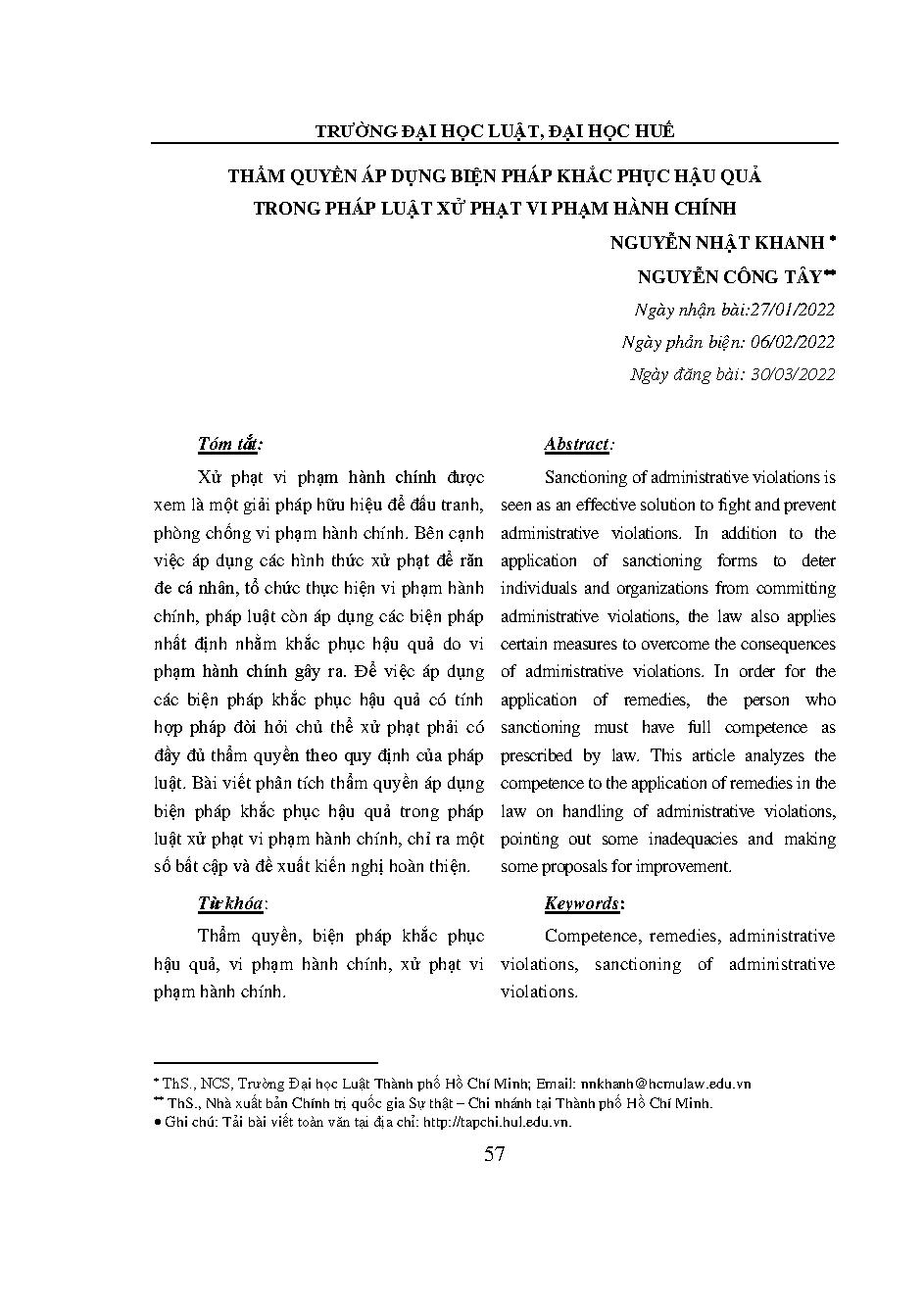 Thẩm quyền áp dụng biện pháp khắc phục hậu quả trong pháp luật xử phạt vi phạm hành chính = Competence to apply remedial measures in the law on sanctioning administrative violations