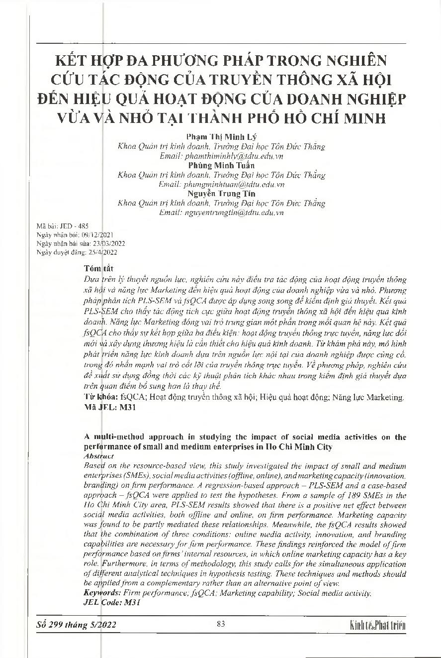 Kết hợp đa phương pháp trong nghiên cứu tác động của truyền thông xã hội đến hiệu quả hoạt động của doanh nghiệp vừa và nhỏ tại Thành Phố Hồ Chí Minh = A multi-method approach in studying the impact of social media activities on the performance of small a