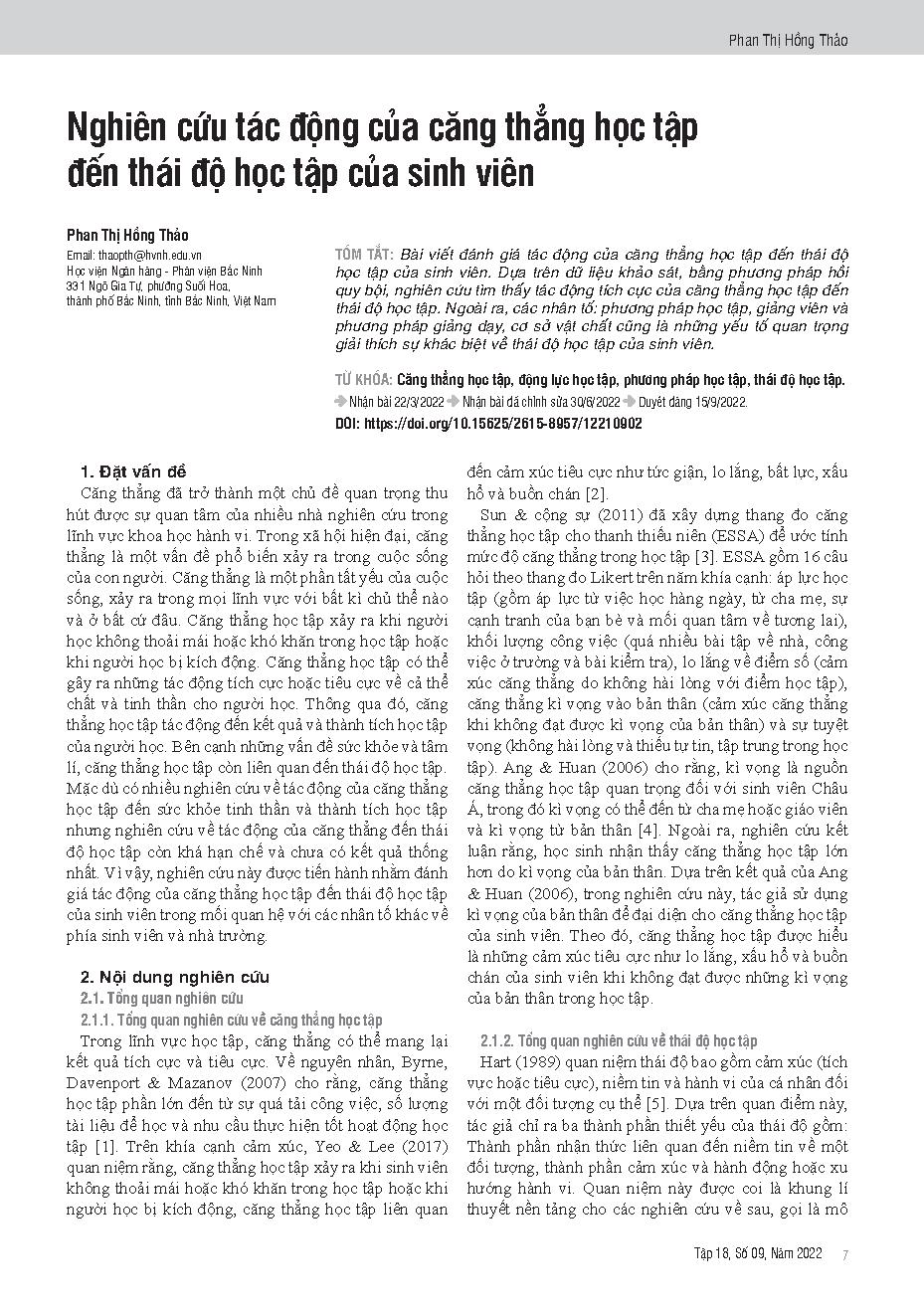 Nghiên cứu tác động của căng thẳng học tập đến thái độ học tập của sinh viên = An investigation on the impacts of academic stress on students’ learning attitude
