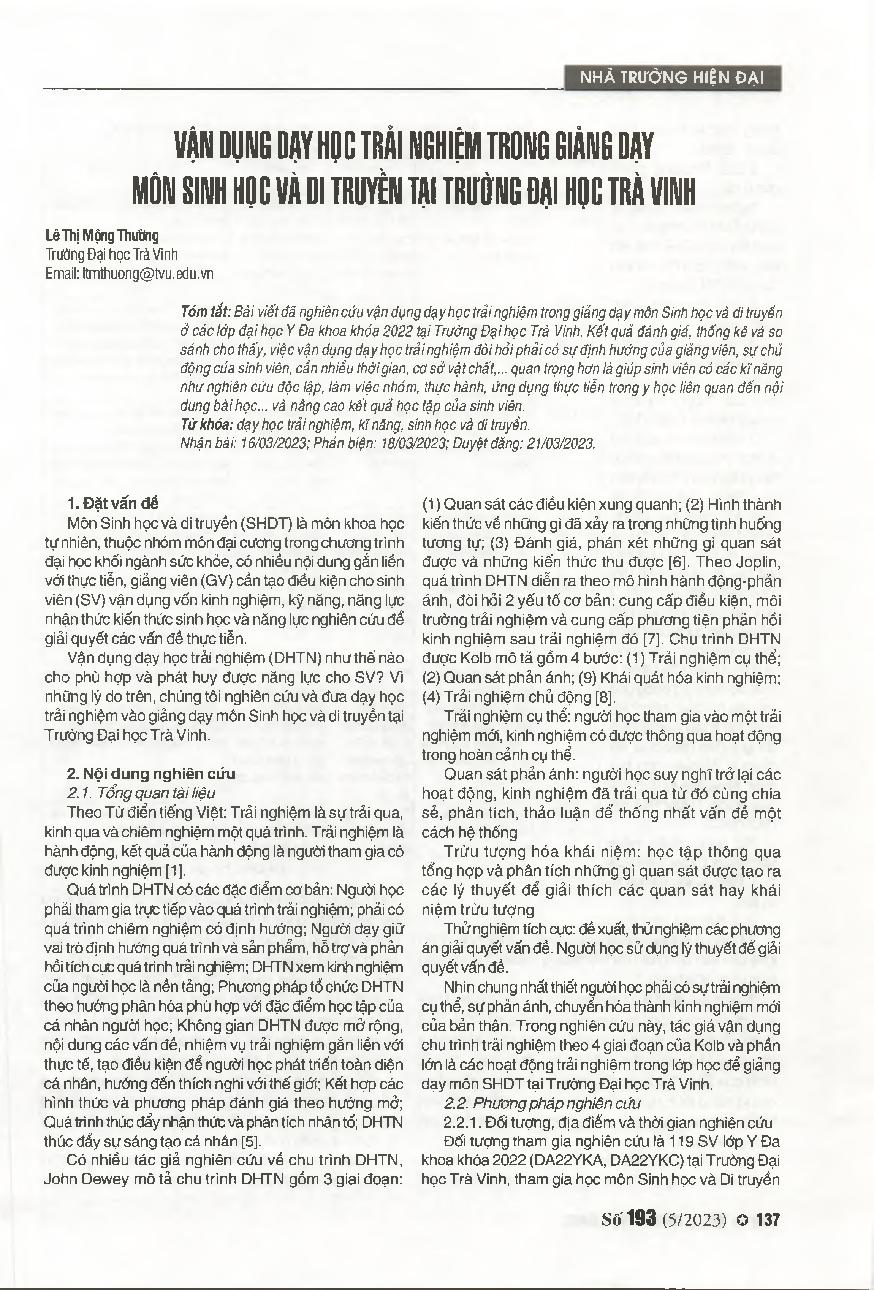 Vận dụng dạy học trải nghiệm trong giảng dạy môn Sinh học và di truyền tại Trường Đại học Trà Vinh = Applying experiential teaching in teaching Biology and Genetics at Tra Vinh University