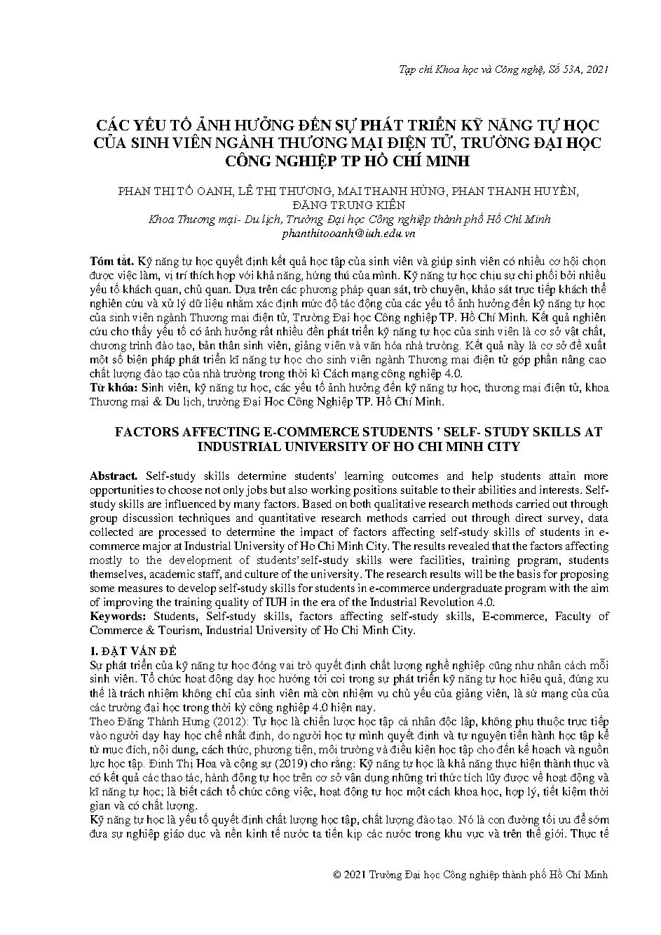 Các yếu tố ảnh hưởng đến sự phát triển kỹ năng tự học của sinh viên ngành thương mại điện tử, trường đại học công nghiệp tp Hồ Chí Minh = Factors affecting e-commerce students ' self-study skills at industrial university of ho chi minh city