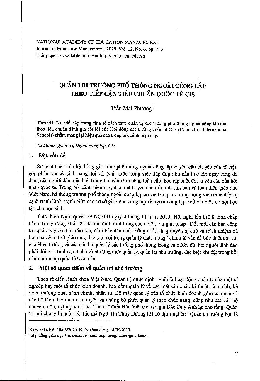 Quản trị trường phổ thông ngoài công lập theo tiếp cận tiêu chuẩn quốc tế CIS = Administration of non-public schools according to CIS international standards