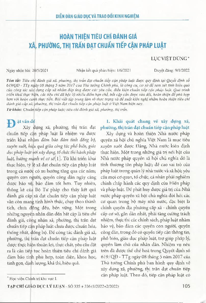 Hoàn thiện tiêu chí đánh giá xã phường, thị trấn đạt chuẩn tiếp cận pháp luật