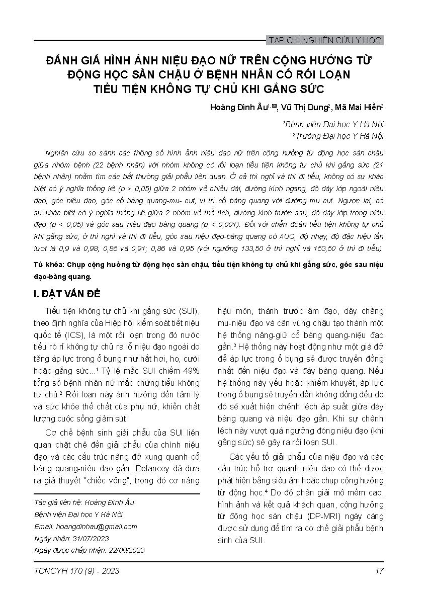 Đánh giá hình ảnh niệu đạo nữ trên cộng hưởng từ động học sàn chậu ở bệnh nhân có rối loạn tiểu tiện không tự chủ khi gắng sức = Evaluation of female urethral parameterson dynamic pelvic floor magnetic resonance imaging in patients with stress urinary inc