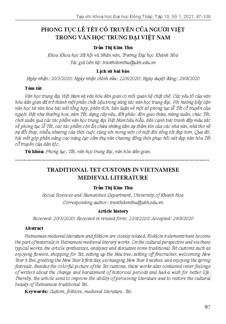 Phong tục lễ tết cổ truyền của người Việt trong văn học trung đại Việt Nam = Traditional Tet customs in Vietnamese medieval literature