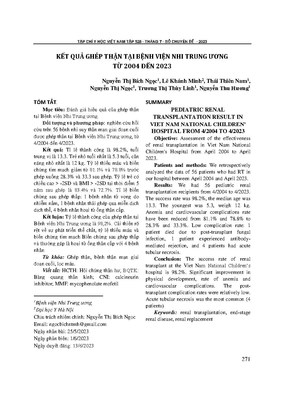 Kết quả ghép thận tại Bệnh viện Nhi Trung ương từ 2004 đến 2023