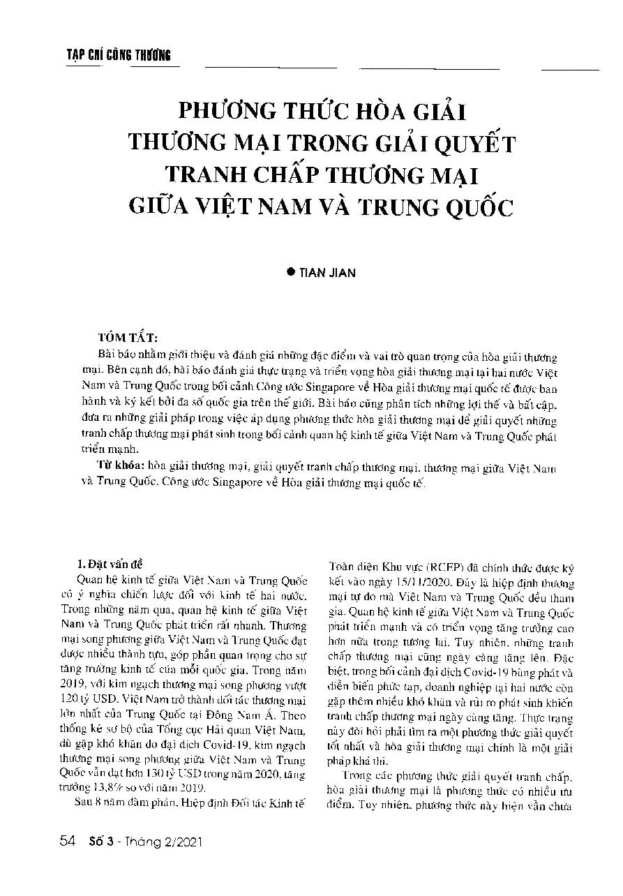 Phương thức hòa giải thương mại trong giải quyết tranh chấp thương mại giữa hai nước Việt Nam và Trung Quốc = Using commercial mediation to resolve commercial disputes between enterprises of Vietnam and enterprises of China