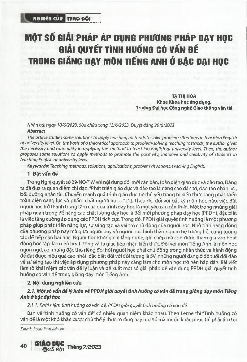 Một số giải pháp áp dụng phương pháp dạy học giải quyết tình huống có vấn đế trong giảng dạy môn Tiếng Anh ở bậc đại học = Some solutions for teaching methods solution to problem situations in teaching English át university learning.
