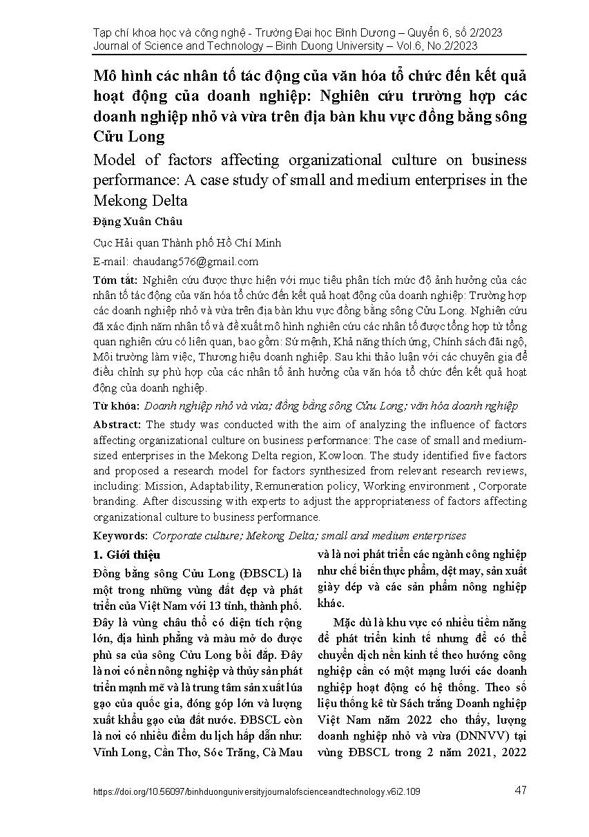 Mô hình các nhân tố tác động của văn hóa tổ chức đến kết quả hoạt động của doanh nghiệp: Nghiên cứu trường hợp các doanh nghiệp nhỏ và vừa trên địa bàn khu vực Đồng bằng sông Cửu Long = Model of factors affecting organizational culture on business perform