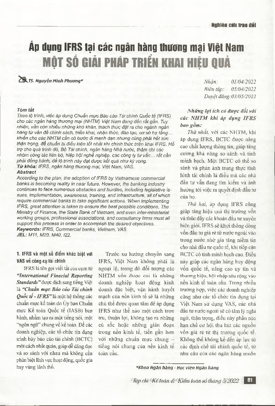 Áp dụng IFRS tại các ngân hàng thương mại Việt Nam Một số giải pháp triển khai hiệu quả = Applying IFRS in Commercial banks of Vietnam and some recommendations