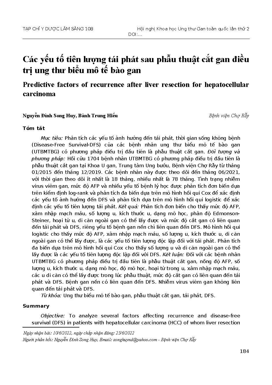 Các yếu tố tiên lượng tái phát sau phẫu thuật cắt gan điều trị ung thư biểu mô tế bào gan = Predictive factors of recurrence after liver resection for hepatocellular carcinoma