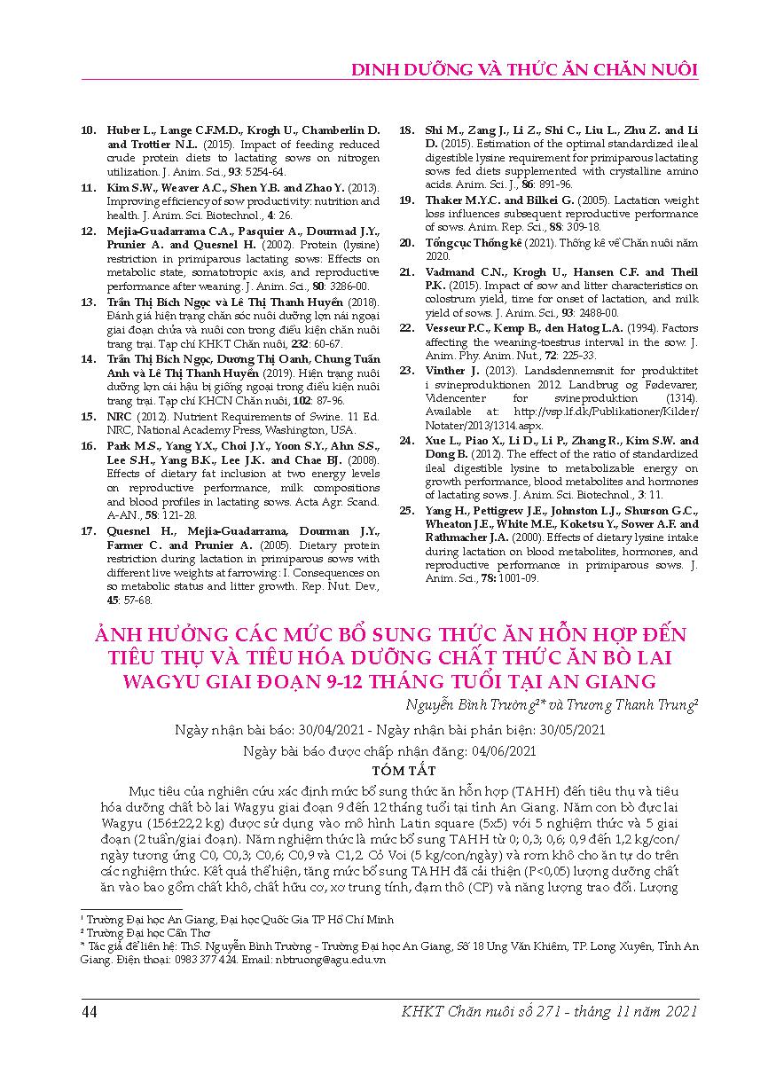 Ảnh hưởng các mức bổ sung thức ăn hỗn hợp đến tiêu thụ và tiêu hóa dưỡng chất thức ăn bò lai Wagyu giai đoạn 9-12 tháng tuổi tại An Giang = Effect of concentrate supplement level in diets on feed intakes and nutrient digestibility of crossbred Wagyu cattle from 9 to 12 months of age in An Giang province