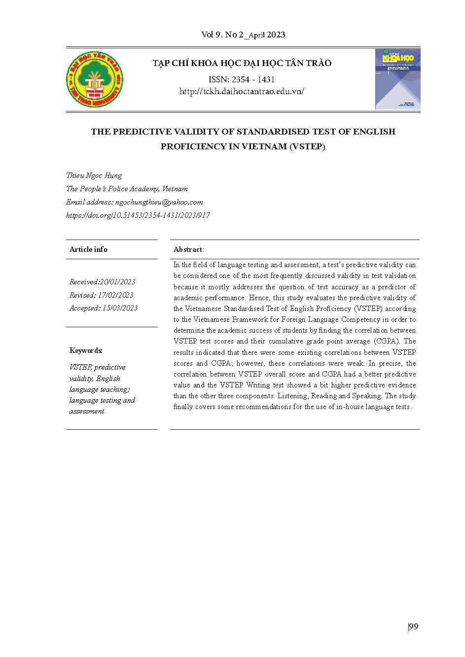 Giá trị dự đoán của bài kiểm tra đánh giá năng lực tiếng Anh của Việt Nam (VSTEP) = The predictive validity of standardised test of English proficiency in Vietnam (VSTEP)