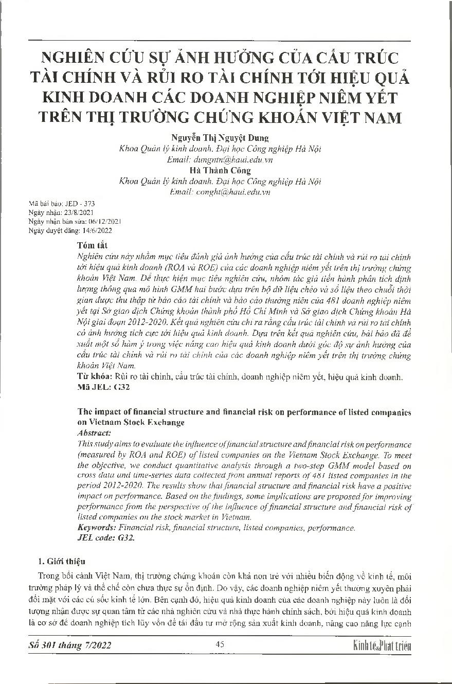 Nghiên cứu sự ảnh hưởng của cấu trúc tài chính và rủi ro tài chính tới hiệu quả kinh doanh các doanh nghiệp niêm yết trên thị trường chứng khoán Việt Nam = The impact of financial structure and financial risk on performance of listed companies on Vietnam