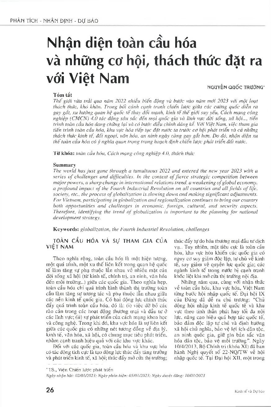 Nhận diện toàn cầu hóa và những cơ hội, thách thức đặt ra với Việt Nam = Identifying globalization and its opportunities and challenges for Vietnam