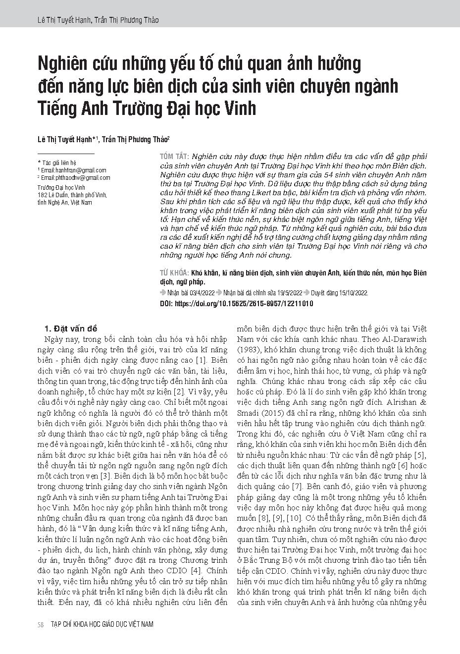 Nghiên cứu những yếu tố chủ quan ảnh hưởng đến năng lực biên dịch của sinh viên chuyên ngành Tiếng Anh Trường Đại học Vinh = An investigation into difficulties in translation courses of english major students at vinh university