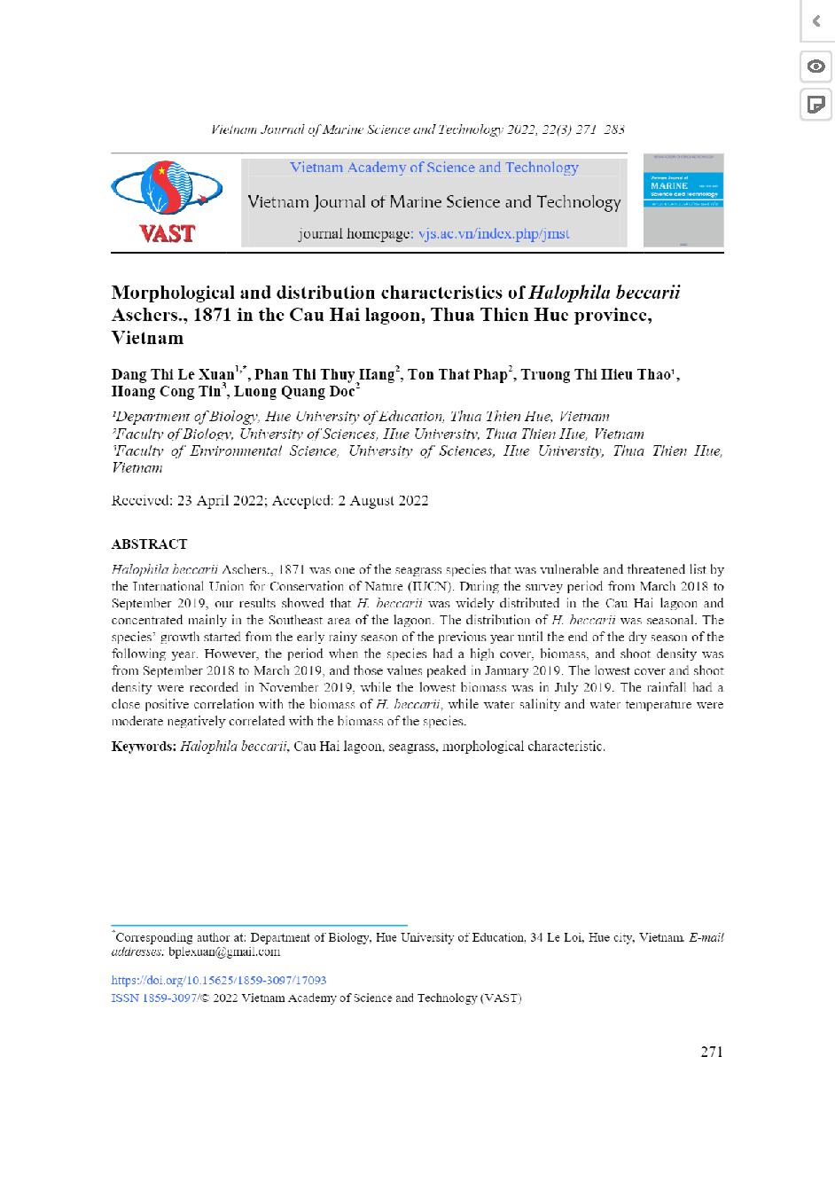 Đặc điểm hình thái và phân bố của Halophila beccarii Aschers., 1871 ở đầm Cầu Hai, tỉnh Thừa Thiên Huế, Việt Nam = Morphological and distribution characteristics of Halophila beccarii Aschers., 1871 in the Cau Hai lagoon, Thua Thien Hue province, Vietnam