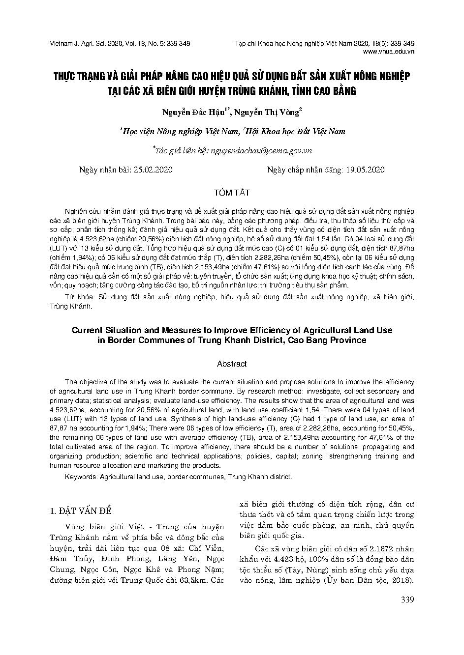 Thực trạng và giải pháp nâng cao hiệu quả sử dụng đất sản xuất nông nghiệp tại các xã biên giới huyện Trùng Khánh, tỉnh Cao Bằng = Current Situation and Measures to Improve Efficiency of Agricultural Land Use in Border Communes of Trung Khanh District, Cao Bang Province