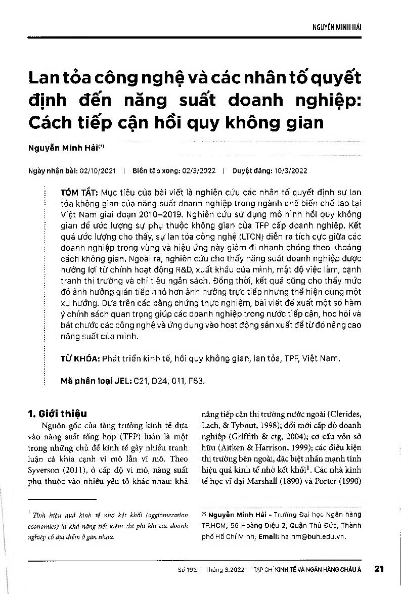 Lan tỏa công nghệ và các nhân tố quyết định đến năng suất doanh nghiệp: Cách tiếp cận hồi quy không gian = Technology Spillovers and Determinants of Firm Productivity: A Spatial Regression Approach