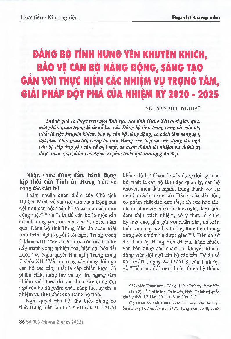 Đảng bộ tỉnh Hưng Yên khuyến khích, bảo vệ cán bộ năng động, sáng tạo gắn với thực hiện các nhiệm vụ trọng tâm, giải pháp đột phá của nhiệm kỳ 2020 - 2025 = The Party Committee of Hung Yen province encourages and protects dynamic and creative cadres assoc