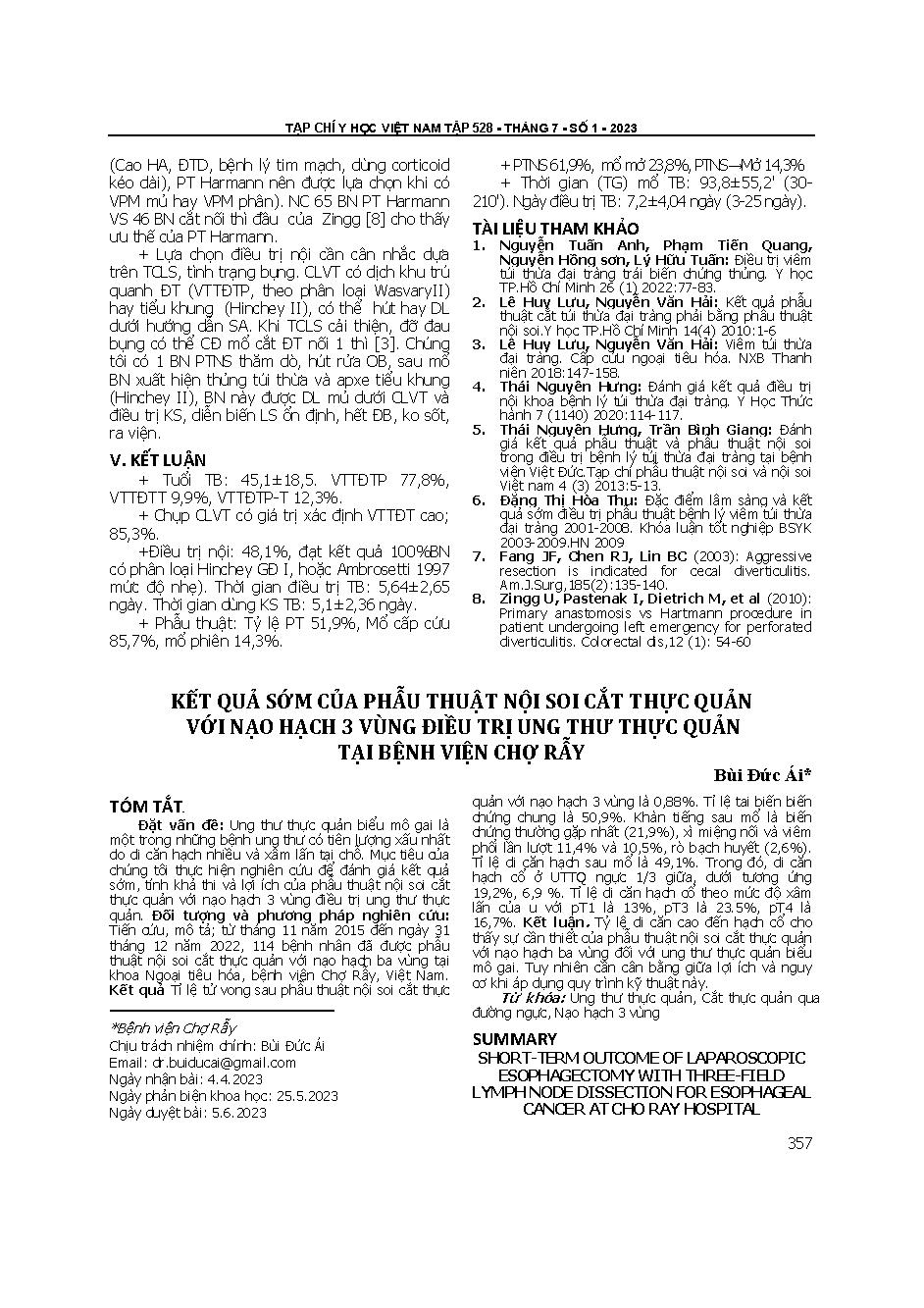 Kết quả sớm của phẫu thuật nội soi cắt thực quản với nạo hạch 3 vùng điều trị ung thư thực quản tại Bệnh viện Chợ Rẫy = Short-term outcome of laparoscopic esophagectomy with three-field lymph node dissection for esophageal cancer at Cho Ray hospital
