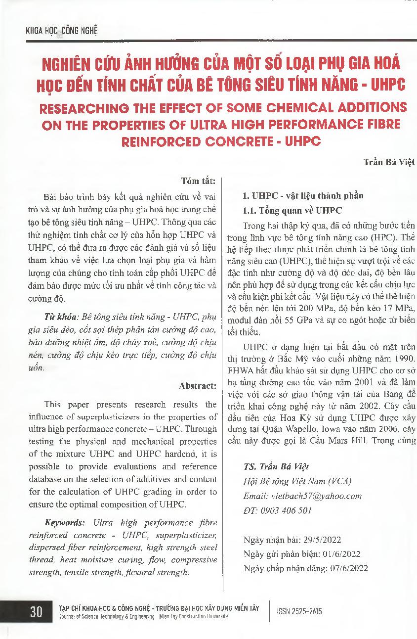 Nghiên cứu ảnh hưởng của một số loại phụ gia hoá học đến tính chất của bê tông siêu tính năng - UHPC = Researching the effect of some chemical additions on the properties of ultra high performance fibre reinforced concrete - UHPC