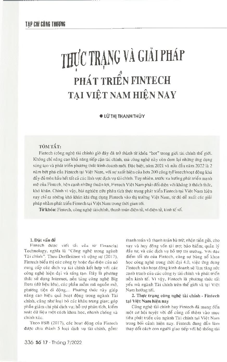 Thực trạng và giải pháp phát triển Fintech tại Việt Nam hiện nay = The current development and solutions to promote the growth of Fintech in Vietnam