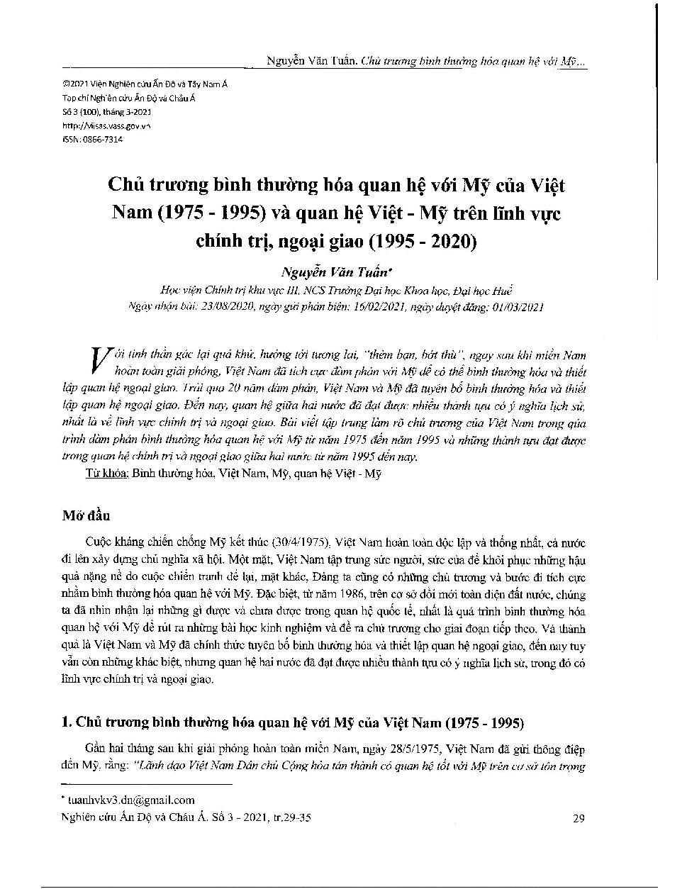 Chủ trương bình thường hóa quan hệ với Mỹ của Việt Nam (1975 -1995) và quan hệ Việt - Mỹ trên lĩnh vực chính trị, ngoại giao (1995 - 2020) = Vietnam’s policy of normalizing its relation with the US (1975 - 1995) and current Vietnam - US political - diplomatic relation