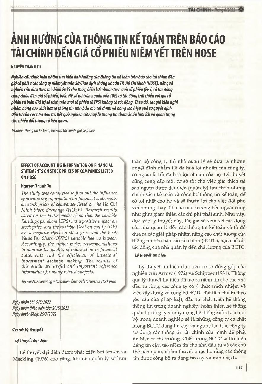 Ảnh hưởng của thông tin kế toán trên báo cáo tài chính đến giá cổ phiếu niêm yết trên HOSE = Effect of accounting information on financial statements on stock prices of companies listed on HOSE