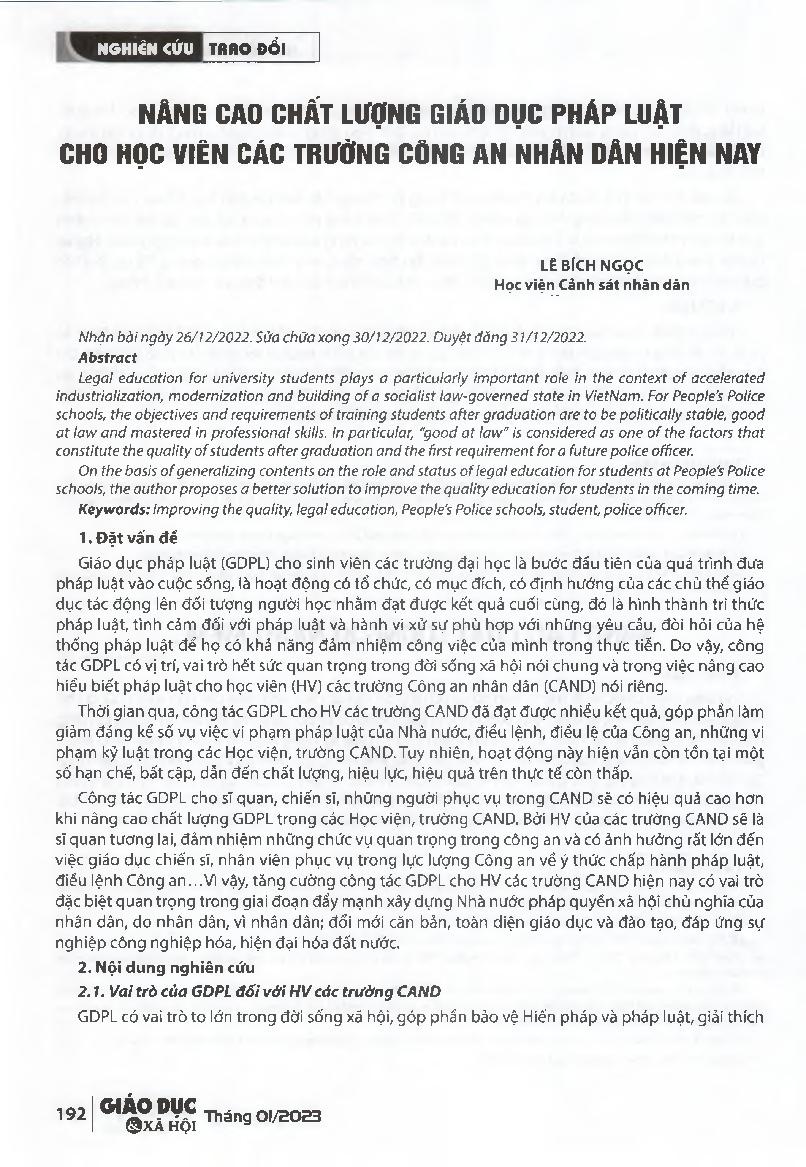 Nâng cao chất lượng giáo dục pháp luật cho học viên các trường công an nhân dân hiện nay = Improving the quality of law education for students at People's Police schools in Vietnam today.