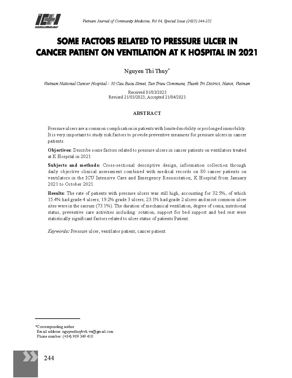 Một số yếu tố liên quan tới loét tì đè trên người bệnh ung thư thở máy tại Bệnh viện K năm 2021 = Some factors related to pressure ulcer in cancer patient on ventilation at K Hospital in 2021