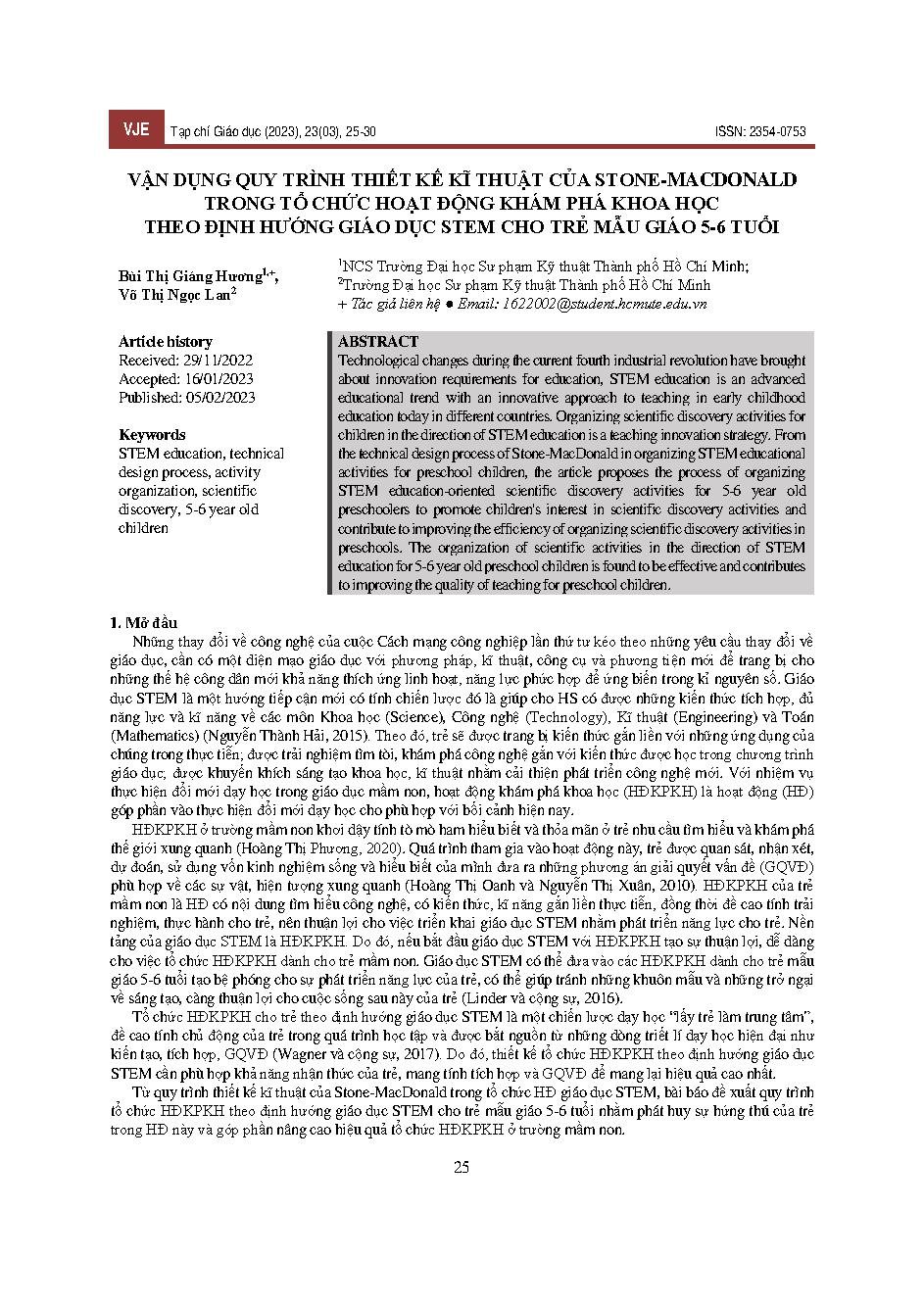 Vận dụng quy trình thiết kế kĩ thuật của stone-macdonald trong tổ chức hoạt động khám phá khoa học theo định hướng giáo dục stem cho trẻ mẫu giáo 5-6 tuổi = Applying the engineering design process of stone-macdonald in organizing stem-oriented scientific