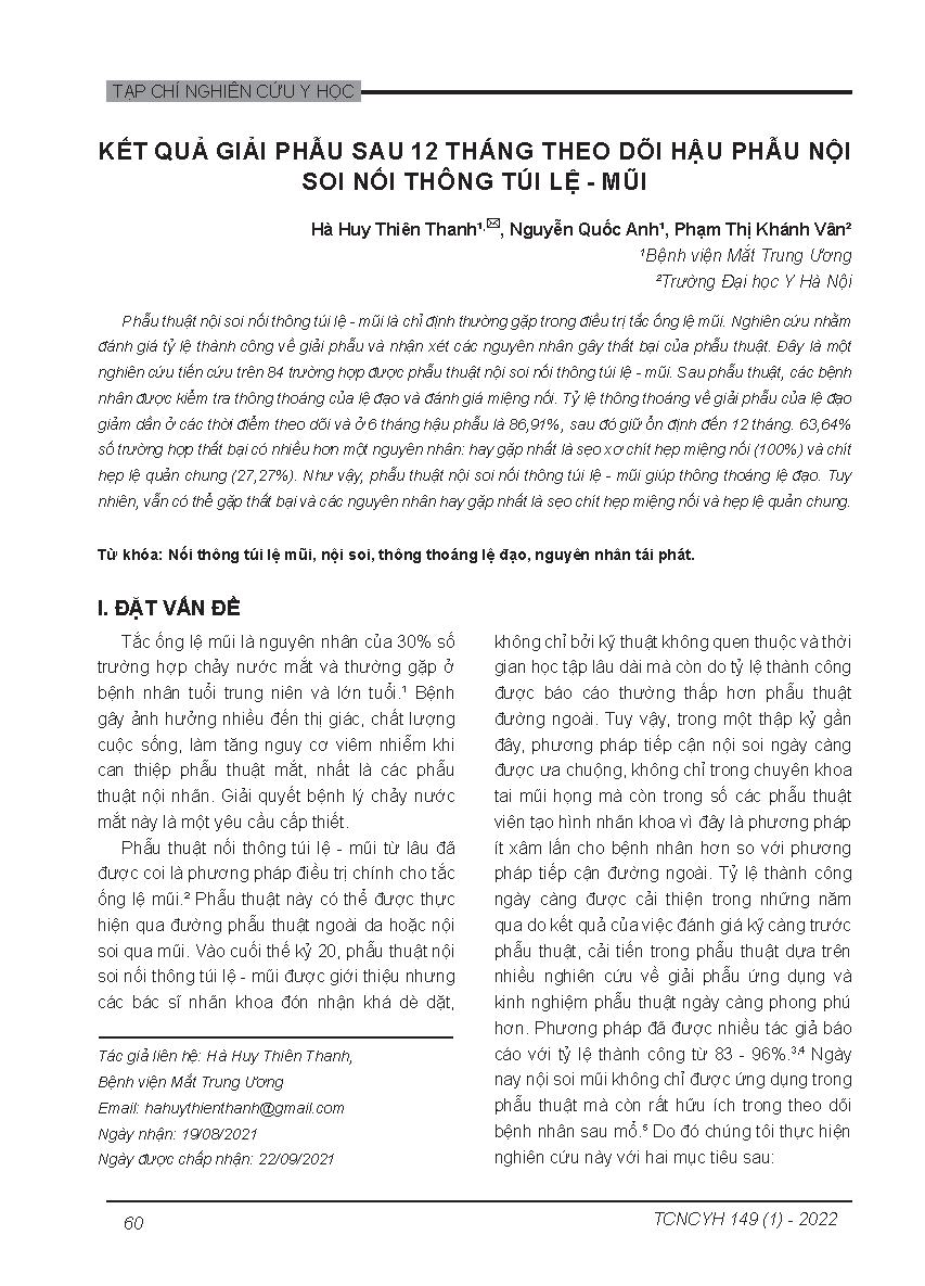 Kết quả giải phẫu sau 12 tháng theo dõi hậu phẫu nội soi nối thông túi lệ - mũi = Endoscopic dacryocystorhinostomy: an evaluation for lacrimal patency and eye watering recurrence