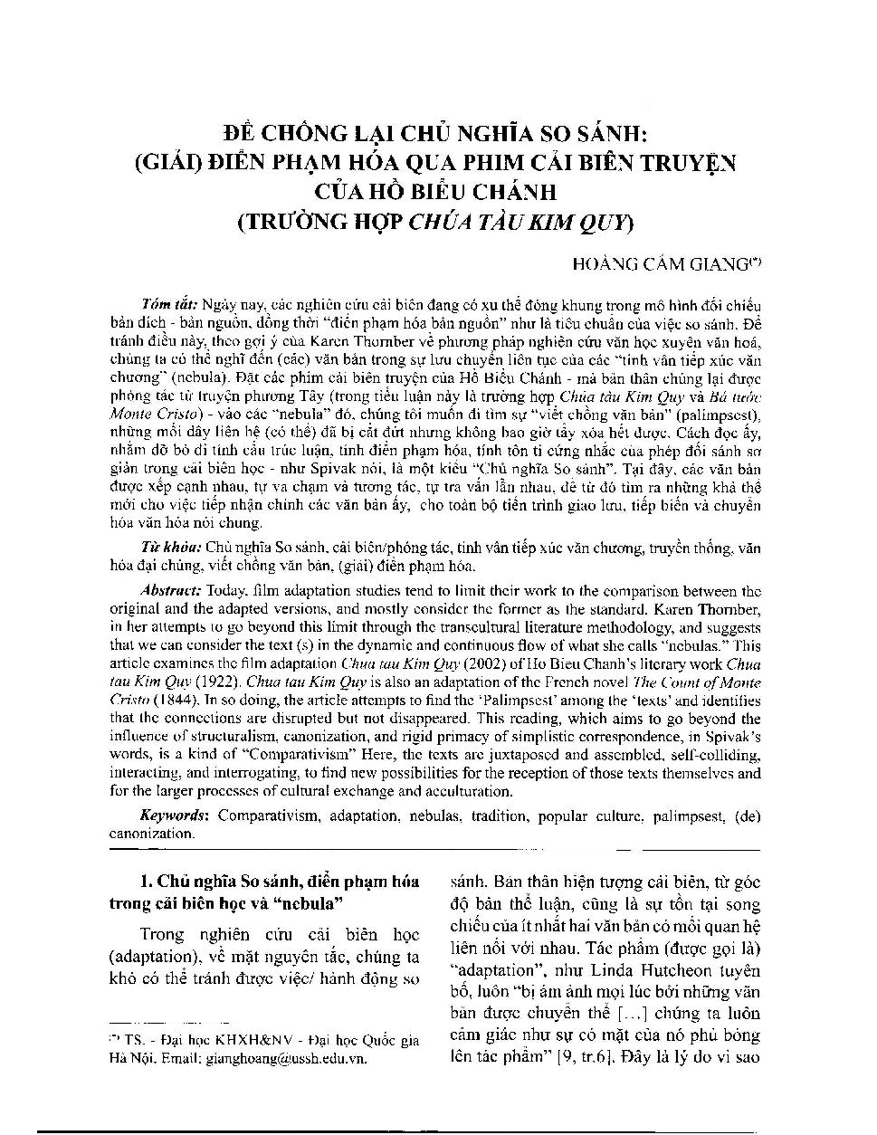 Để chống lại chủ nghĩa so sánh: (giải) điển phạm hóa qua phim cải biên truyện của Hồ Biểu Chánh (Trường hợp Chúa tàu Kim Quy) = Against comparativism: (De) canonization of the film adaptation of Ho Bieu Chanh's novels (case of Chúa tàu Kim Quv)