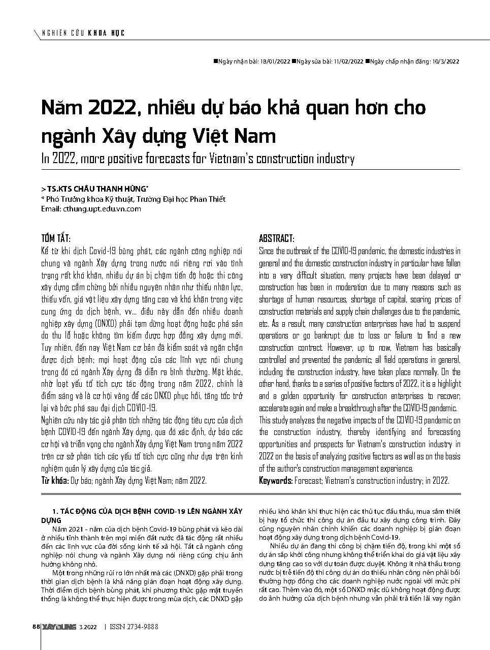 Năm 2022, nhiều dự báo khả quan hơn cho ngành Xây dựng Việt Nam = In 2022, more positive forecasts for Vietnam&; 39;s construction industry
