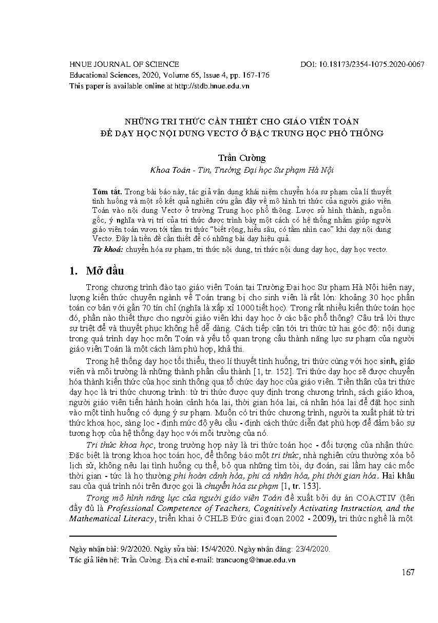 Những tri thức cần thiết cho giáo viên toán để dạy học nội dung vectơ ở bậc trung học phổ thông = Mathematics teachers’ knowledge necessary for teaching vectors at high schools