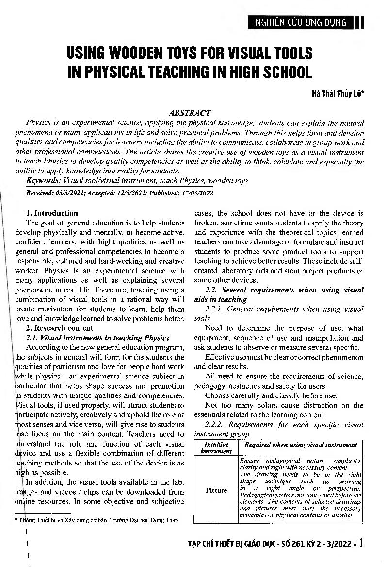 Sử dụng đồ chơi gỗ làm dụng cụ trực quan trong dạy học vật lý ở trường phô thông = Using wooden toys for visual tools in physical teaching in high school