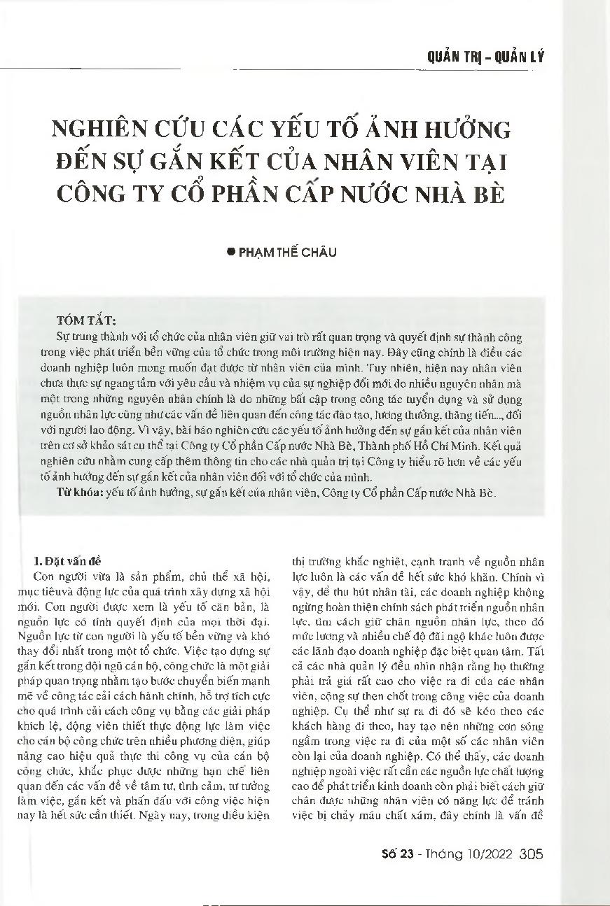 Nghiên cứu các yếu tố ảnh hưởng đến sự gắn kết của nhân viên tại công ty cổ phần Cấp nước Nhà Bè = Factors affecting the employee engagement at Nha Be Water Supply Joint stock Company