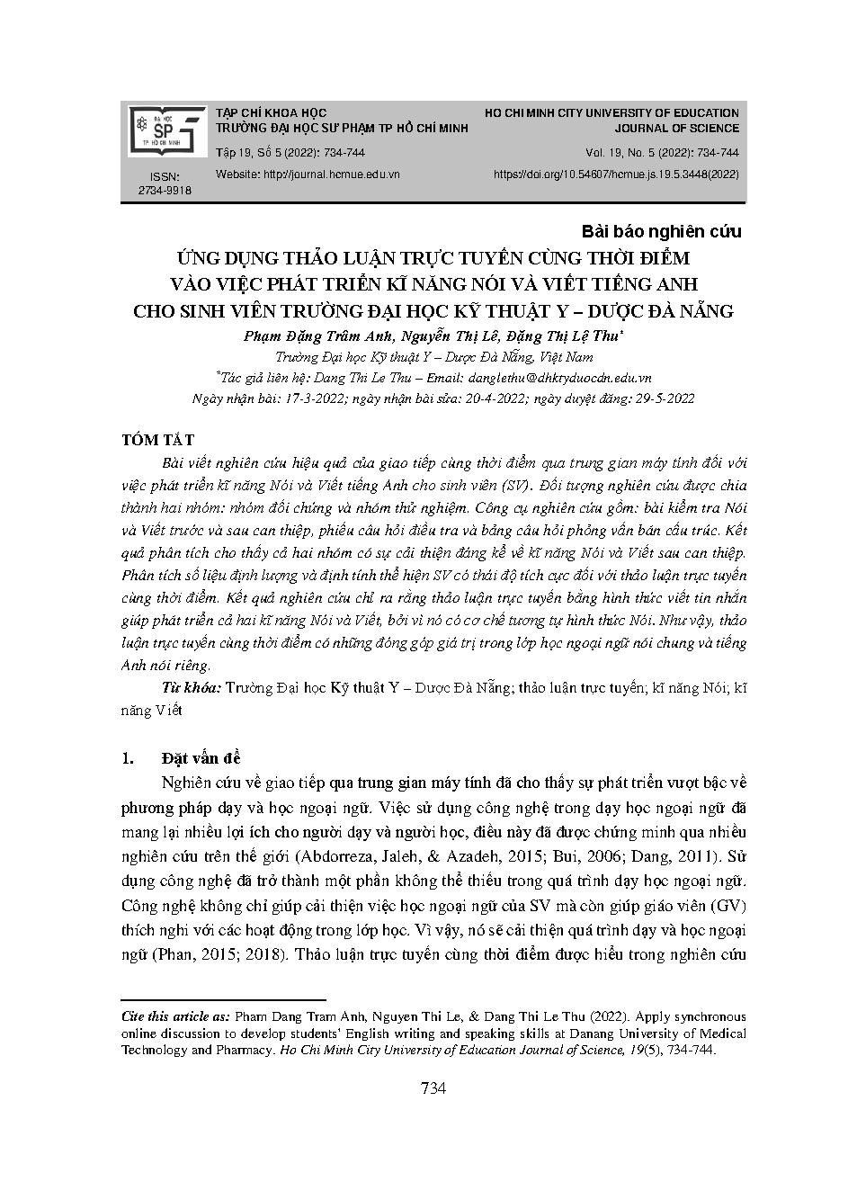 Ứng dụng thảo luận trực tuyến cùng thời điểm vào việc phát triển kĩ năng nói và viết tiếng Anh cho sinh viên trường đại học kỹ thuật y – dược Đà Nẵng = Apply synchronous online discussion to develop students’ english writing and speaking skills at danang