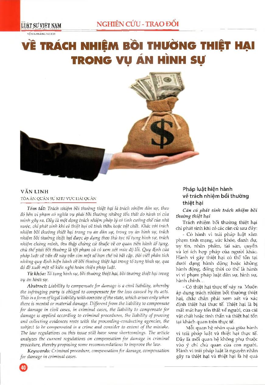 Về trách nhiệm bồi thường thiệt hại trong vụ án hình sự = Regarding liability to compensate for damages in criminal cases
