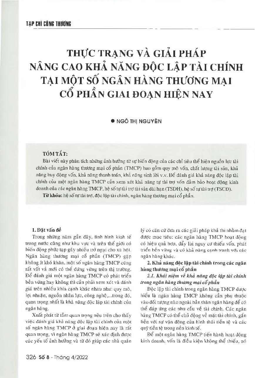 Thực trạng và giải pháp nâng cao khả năng độc lập tài chính tại một số ngân hàng thương mại cổ phần giai đoạn hiện nay = The current situation and solutions to improve the financial independence of some joint stock commercial banks
