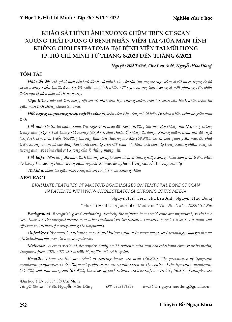 Khảo sát hình ảnh xương chũm trên CT Scan xương thái dương ở bệnh nhân viêm tai giữa mạn tính không cholesteatoma tại Bệnh viện Tai mũi họng thành phố Hồ Chí Minh từ tháng 8/2020 đến tháng 6/2021