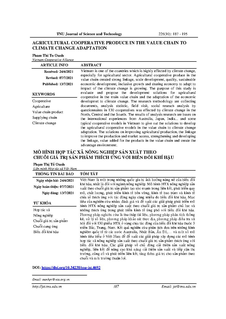Mô hình hợp tác xã nông nghiệp sản xuất theo chuỗi giá trị sản phẩm thích ứng với biến đổi khí hậu = Agricultural cooperative produce in the value chain to climate change adaptation