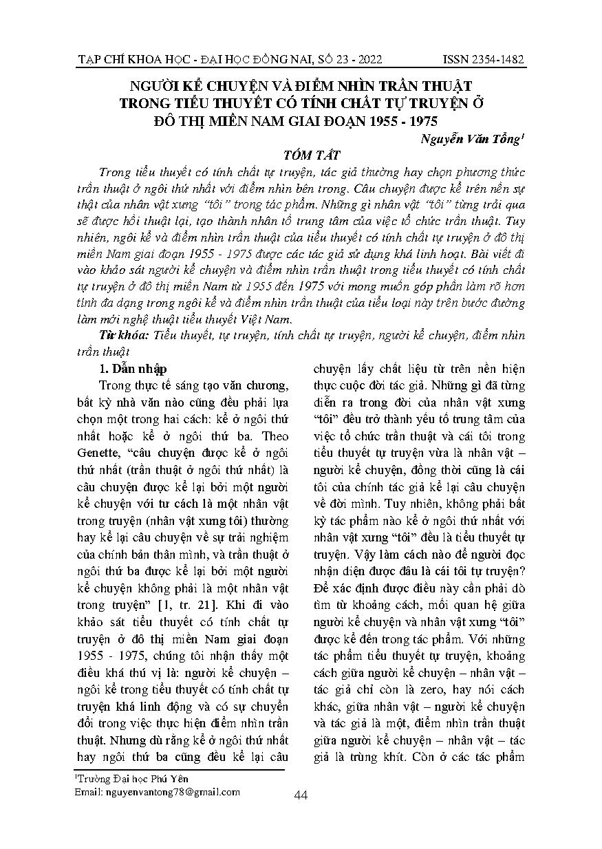 Người kể chuyện và điểm nhìn trần thuật trong tiểu thuyết có tính chất tự truyện ở đô thị miền Nam giai đoạn 1955 - 1975 = Narrators and the autobiographical novel’s narrative views in southern urban novel period 1955 - 1975
