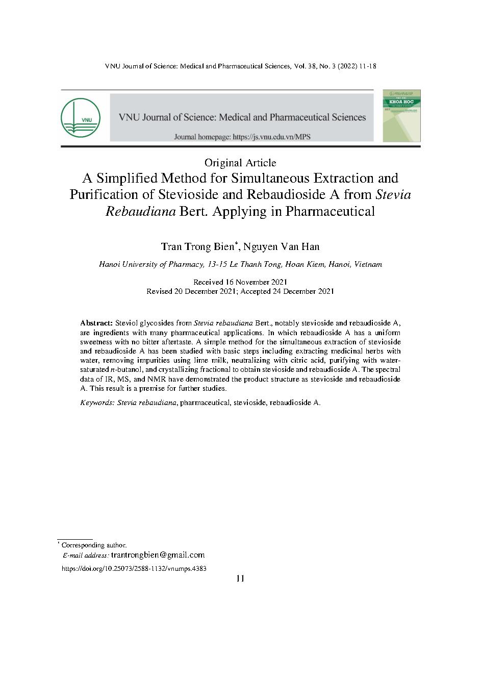 Nghiên cứu phương pháp chiết xuất và tinh chế đồng thời Steviosid và Rebaudiosid A ứng dụng trong dược phẩm từ Cỏ ngọt (Stevia rebaudiana Bert.)
