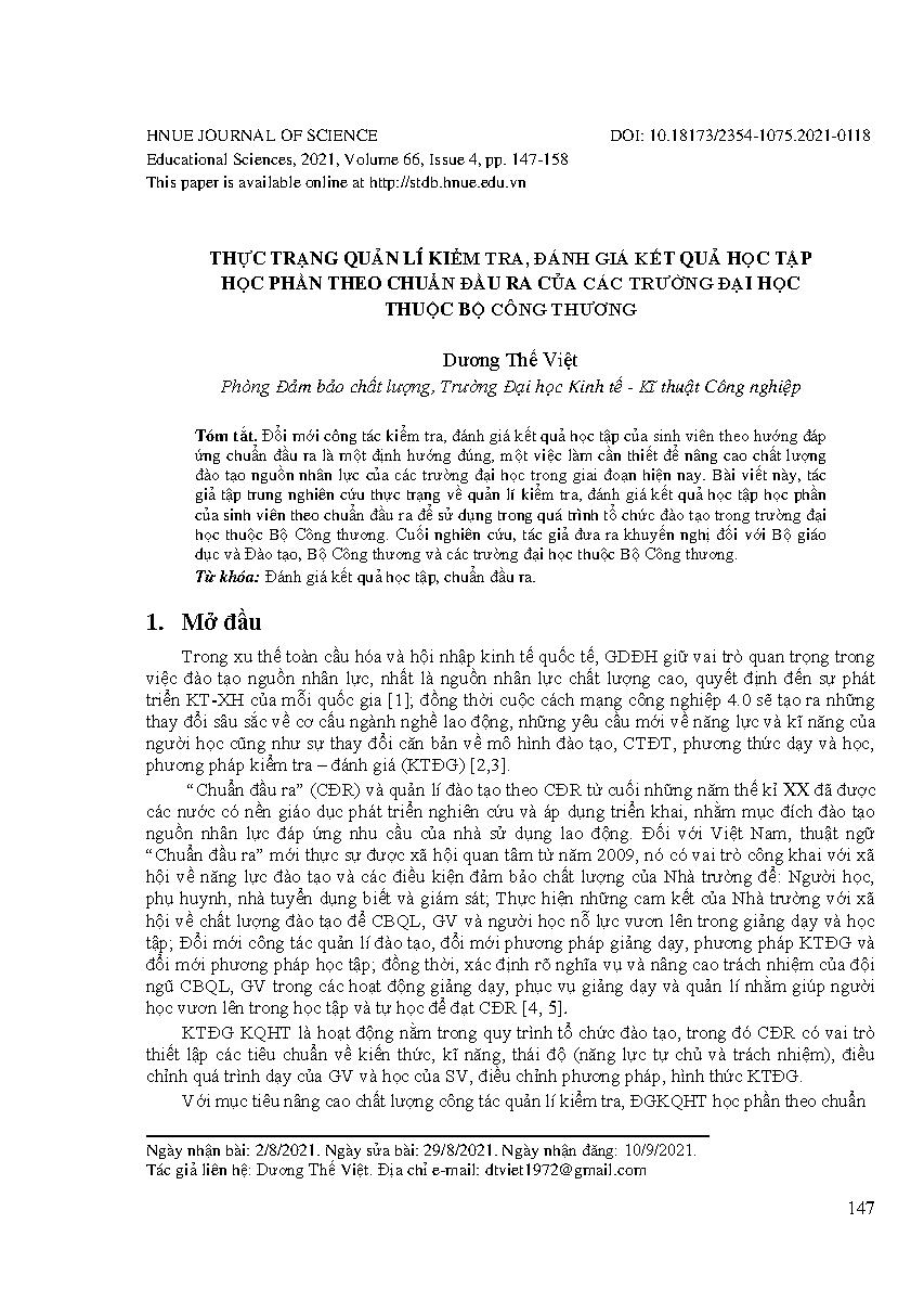Thực trạng quản lí kiểm tra, đánh giá kết quả học tập học phần theo chuẩn đầu ra của các trường đại học thuộc Bộ Công thương = The situation of inspection management, learning outcomes assessment through Outcome standard of Universities of Ministry of Industry and Trade