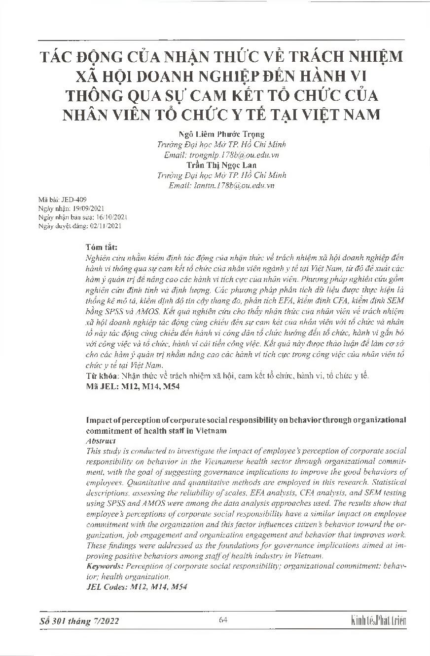 Tác động của nhận thức về trách nhiệm xã hội doanh nghiệp đến hành vi thông qua sự cam kết tổ chức của nhân viên tổ chức y tế tại Việt Nam = Impact of perception of corporate social responsibility on behavior through organizational commitment of health st